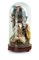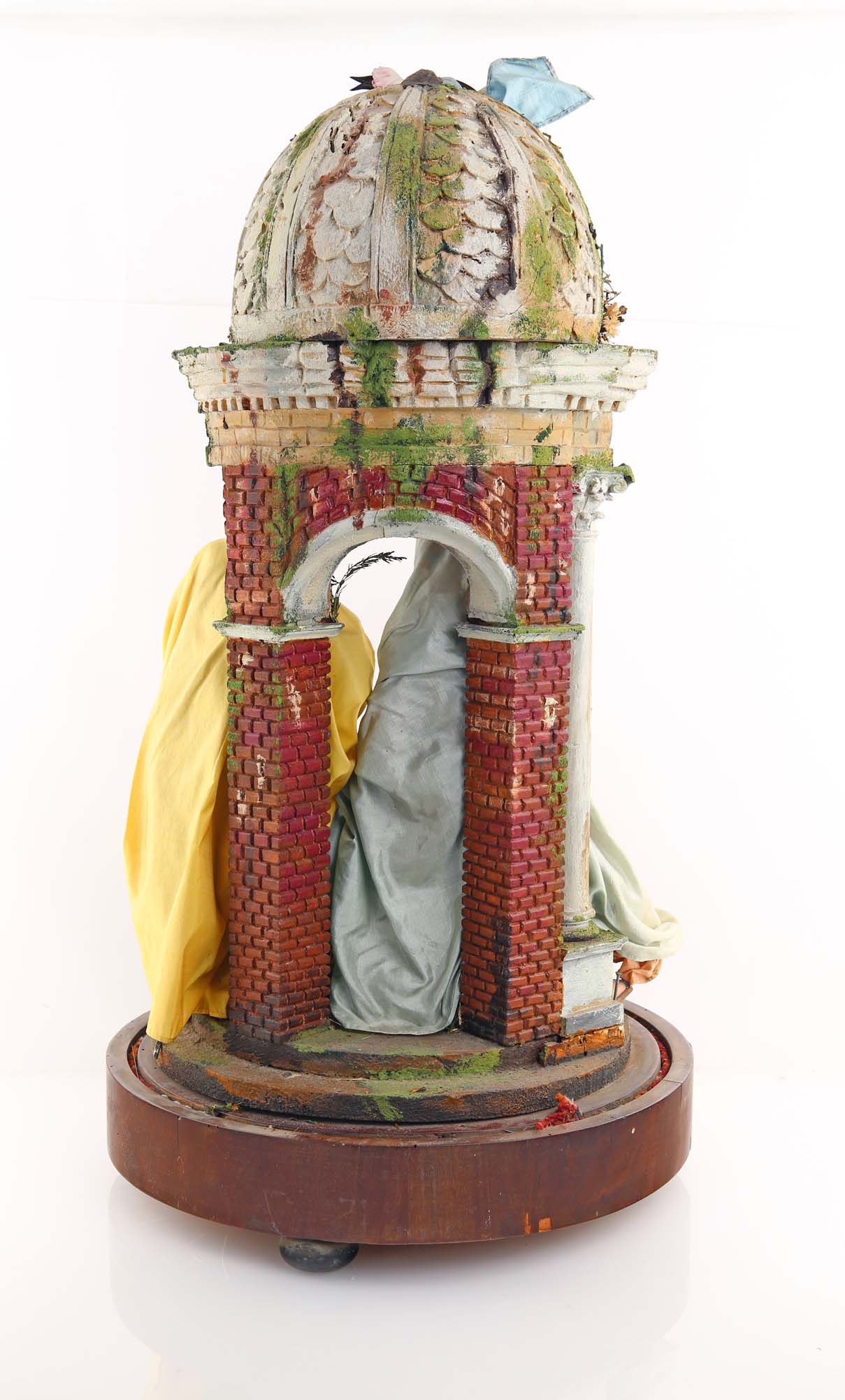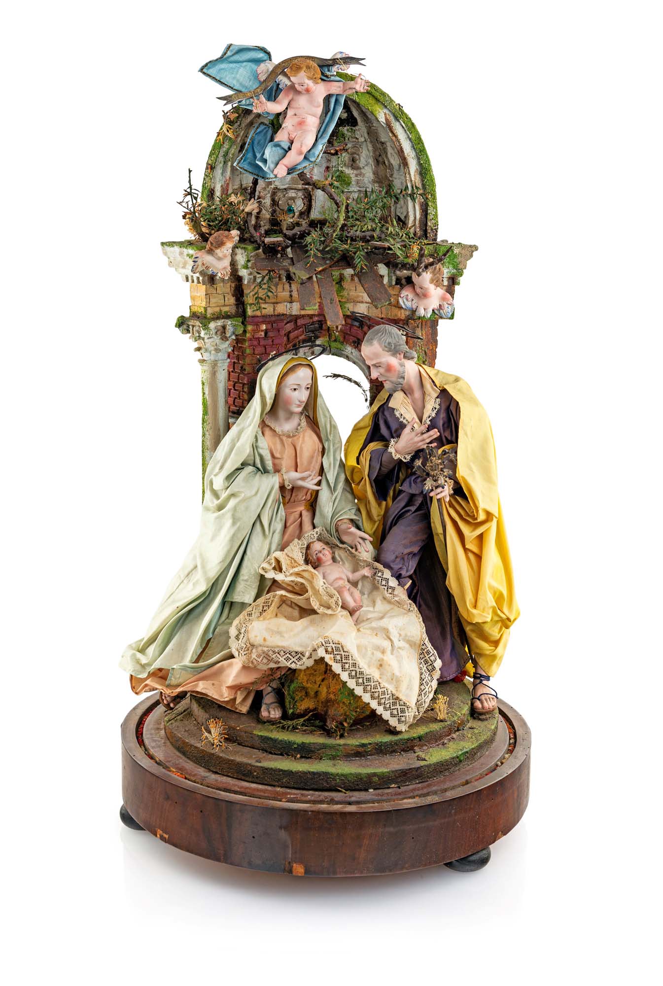 Gruppo della natività struttura architettonica in legno, cartapesta e sughero arricchita da decorazioni in paglia, muschio, foglie; supporto circolare in mogano protetto da campana in vetro. Madonna abbigliata con tunica rosa ed ampio velo sulla testa con aureola ad anello in argento; altezza cm 35; San Giuseppe con camicia avorio, tunica e panciotto viola, mantello in seta gialla, bastone in legno fiorito, altezza cm 42; Bambinello in terracotta policroma, cm 11; due cherubini legati (cm 5x7 e cm 7x6); un puttino in legno policromo con nastro svolazzante in argento con iscritto "gloria in excelsis deo" (cm 12)