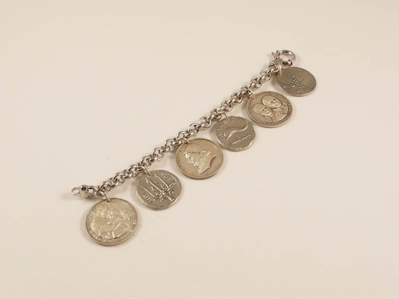 BRACCIALE IN ARGENTO STERLING CON CHARMES - SILVER STERLING BRACIALET WITH CHARMES realizzato con monete in argento di varie raffigurazioni tra le quali, una per il quinto centenario della nascita di Raffaello gr 95