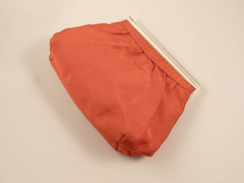 POCHETTE IN TESSUTO ROSSO CON CHIUSURA TRASPARENTE - CLUTCH BAG IN RED FABRIC WITH TRASPARENT LOCKING Salvatore Ferragamo tessuto ripreso in chiusura e lunga catena dorata, lievi difetti