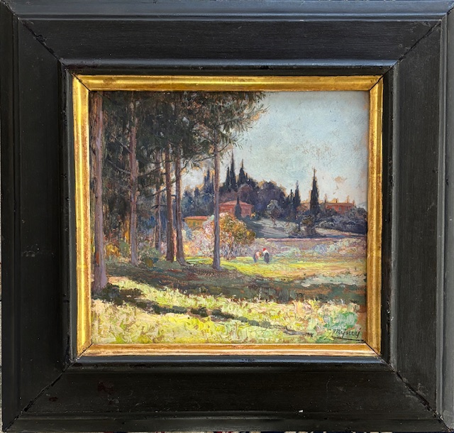Guido Meineri Cuneo 1869 - 1944 Montese (MO) Paesaggio di entroterra ligure Olio su cartone cm 27x26 firmato in basso a dx