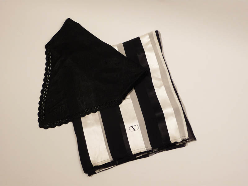 LOTTO - LOT Valentino una stola in seta a righe verticali bianche e nere e uno scialle nero in cotone, macchie (2)