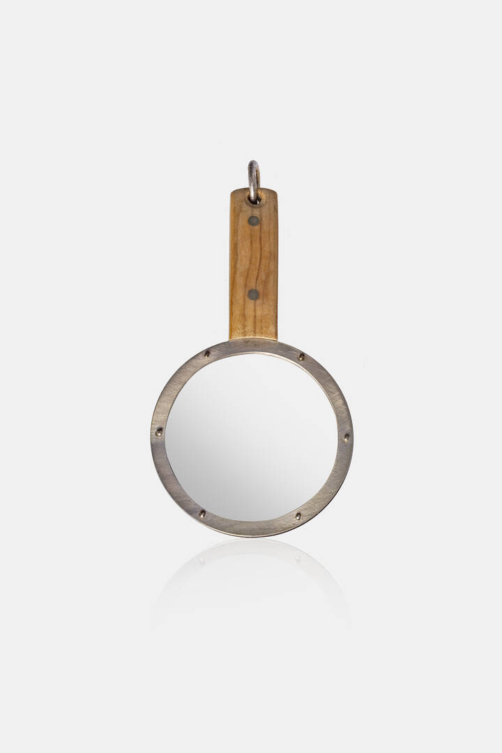 Scherzoso ciondolo in legno e argento 925/1000, raffigurante uno specchio con doppio vetro.