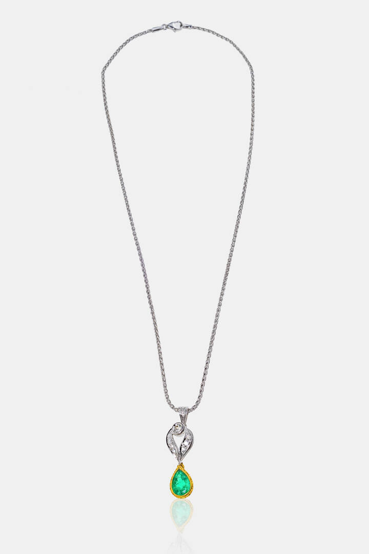 in oro giallo e bianco con ciondolo con goccia di smeraldo colombiano di ct 2,0 ca e piccoli diamanti taglio brillante per totali ct 0,35 ca