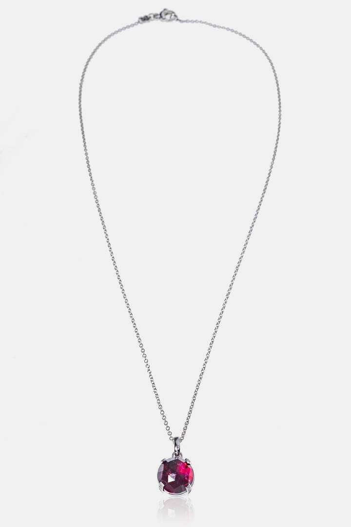 Catena con ciondolo in oro bianco, firmata "Pasquale Bruni", con granato taglio rotondo briolette. Piccoli diamanti taglio brillante a decoro per totali ct 0,10 ca.