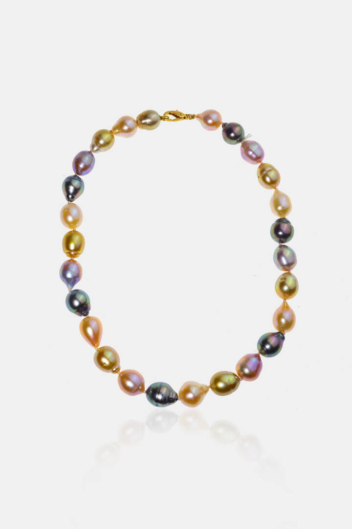 composto da un filo di perle scaramazze South Sea nei toni del bianco, rosa, gold e Tahiti; dal diam di mm 12,7 a 13. Chiusura in oro giallo a moschettone.