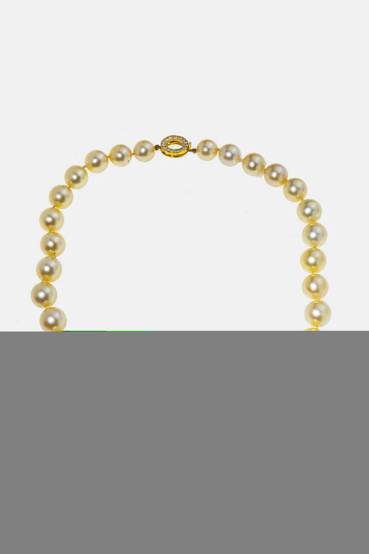 composto da una filo di perle australiane a scalare dal diam di mm 11,7-15,3 ca. Chiusura in oro giallo ad anello con diamanti taglio brillante per totali ct o,80 ca.