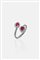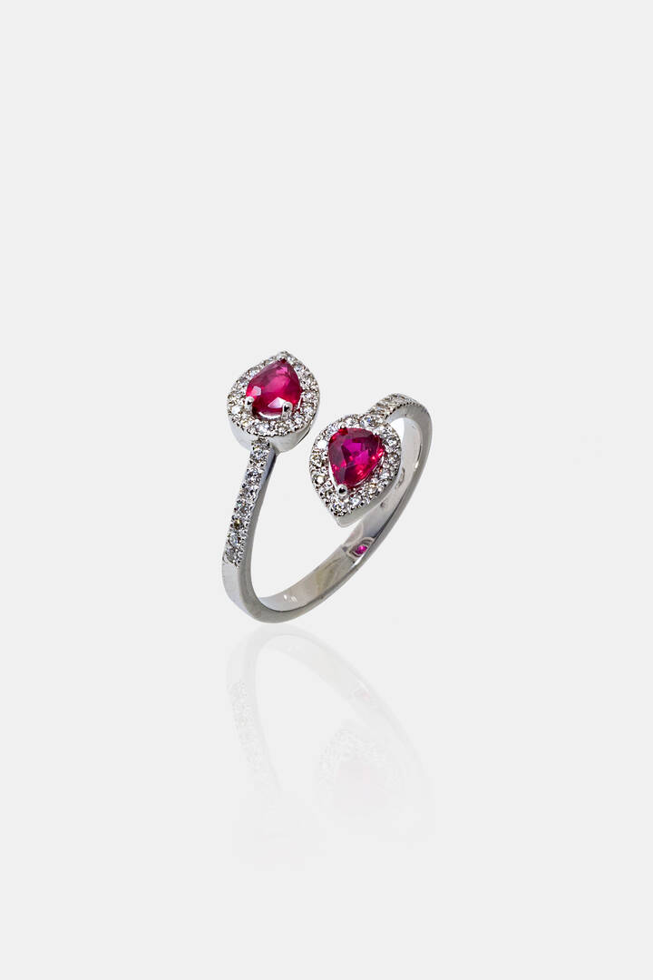in oro bianco, modello contrarié, con due rubini taglio a goccia per totali ct 1,10 ca e diamanti taglio brillante per totali ct 0,40 ca, probabile colore G-H, purezza IF-VVS