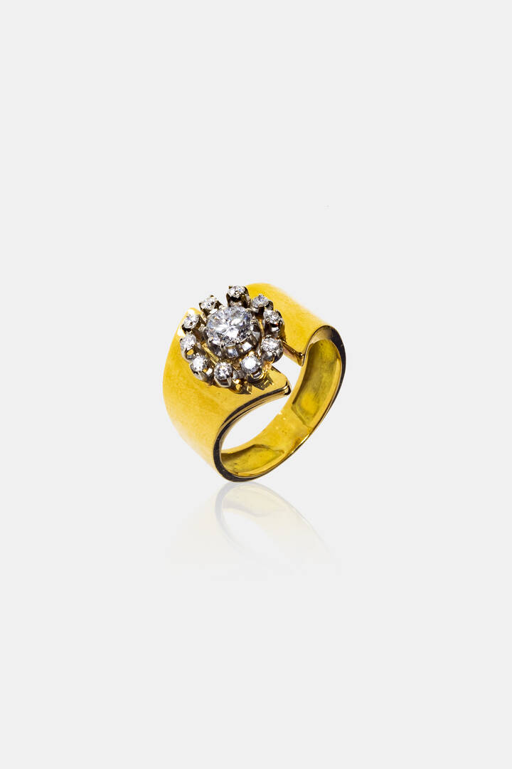 in oro giallo, sommità con al centro fiore in diamanti taglio brillante per totali ct 0,80 ca