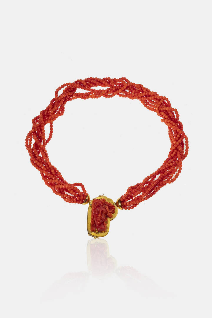 composto da nove fili di sfere di corallo mediterraneo nei toni del rosso. Chiusura in oro giallo con volto femminile in corallo inciso
