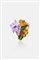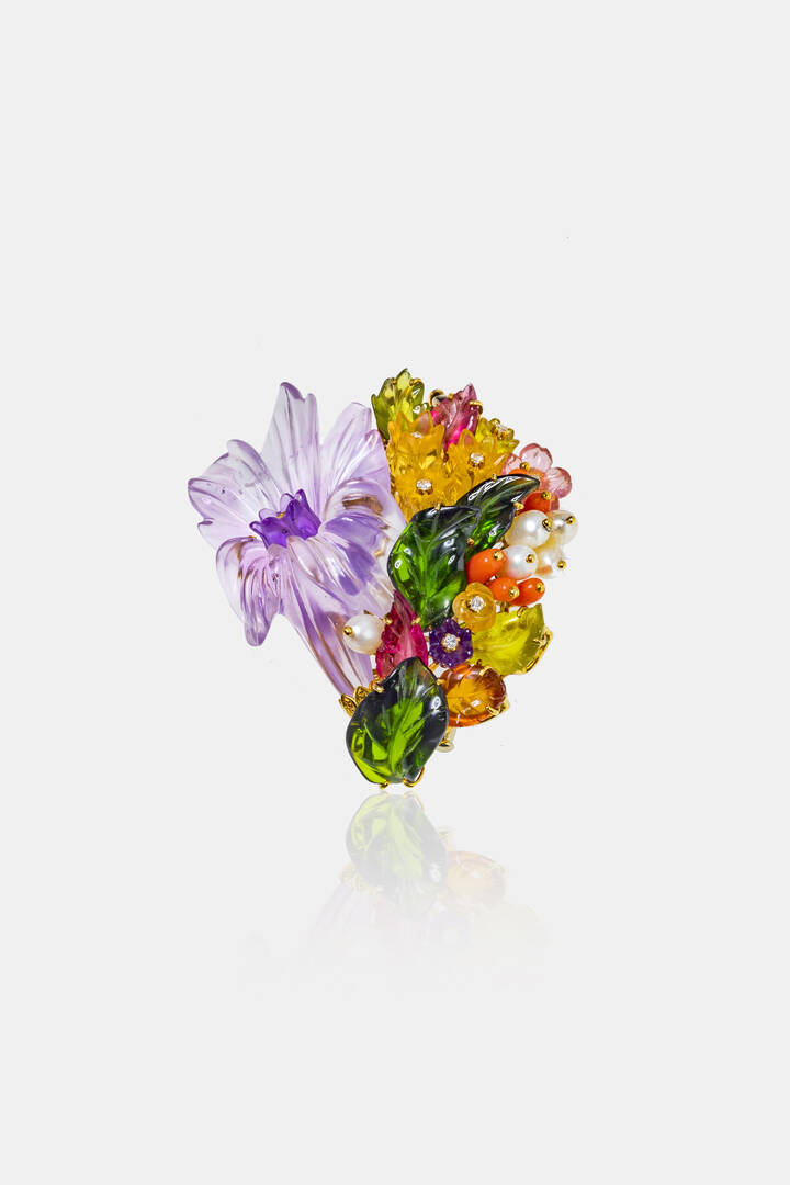 in oro giallo, a forma di mazzo fiorito, con ametista taglio a fiore, coralli, cromodiopside, perle e quarzo citrino a decoro. Diamanti taglio brillante per totali ct 0,17 ca