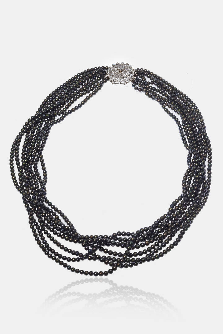 composta da otto fili perle di acqua dolce nei toni del nero-verde del diam. di mm 4. Chiusura oro bianco con diamanti taglio 8/8 per totali ct 0,40 ca