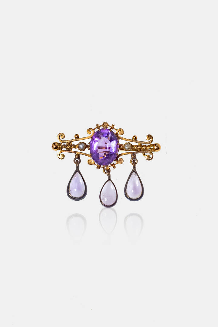 in oro rosa a bassa caratura, XIX secolo, a barretta con al centro gemma viola sintetica; tre gocce in argento con cristallo di rocca pendenti