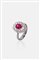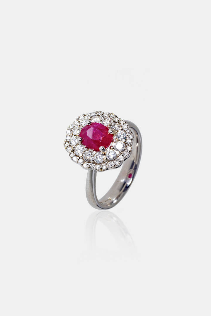 in oro bianco, sommità con al centro rubino taglio ovale di ct 1,0 ca e diamanti taglio brillante per totali ct 0, 70 ca, probabile colore G-H, purezza IF-VVS