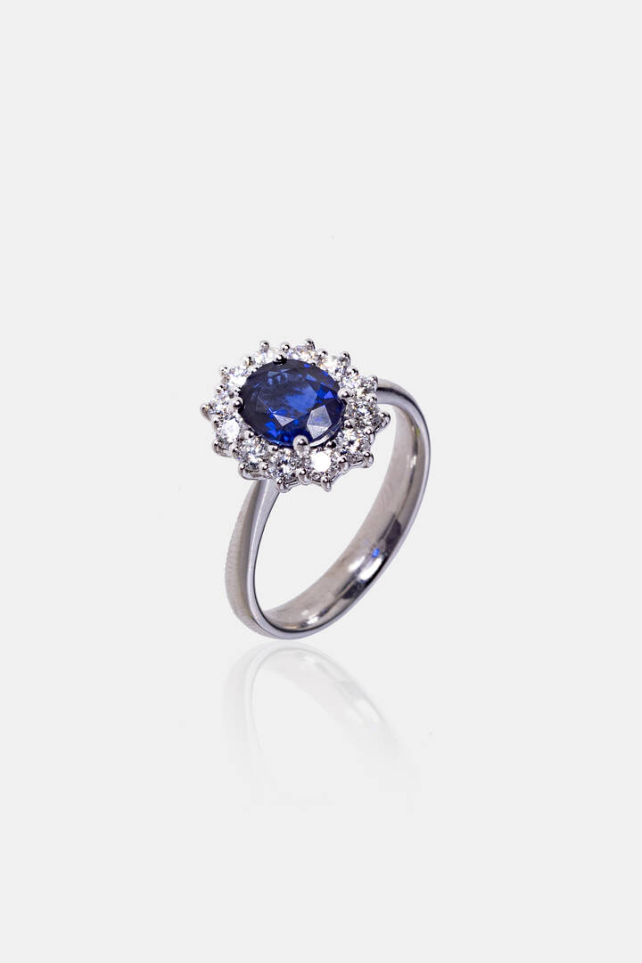 in oro bianco, sommità a margherita, con al centro zaffiro taglio ovale di ct 1,50 ca, contornato da diamanti taglio brillante per totali ct 0,60 ca, probabile colore G, purezza VVS