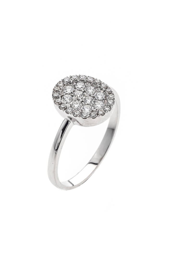 in oro bianco, sommità di forma ovale con pavé di diamanti taglio brillante per totali ct 0,42 ca, probabile colore G-H, purezza IF-VVS