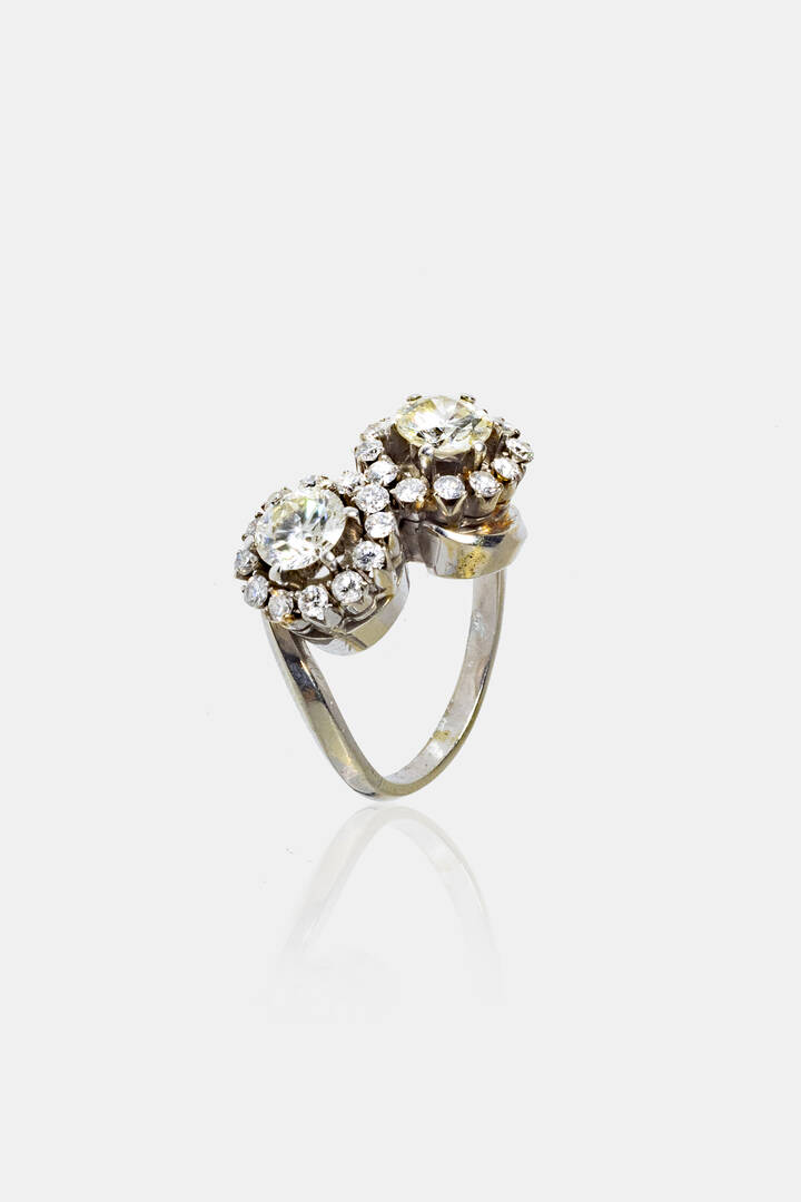 in platino, modello contrarié, anni '50, con due diamanti taglio brillante per totali ct 1,20 ca e diamanti taglio brillante per totali ct 0,40 ca.