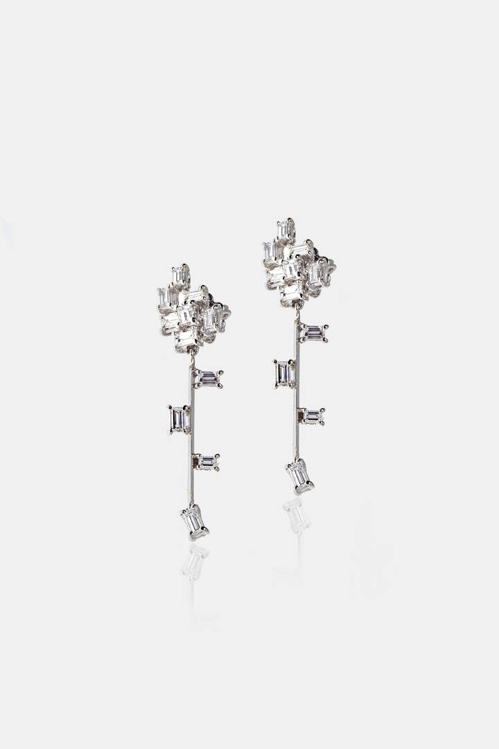 in oro bianco, con barrette di diamanti taglio baguette pendenti per totali ct 1,50 ca, probabile colore G-H, purezza IF-VVS