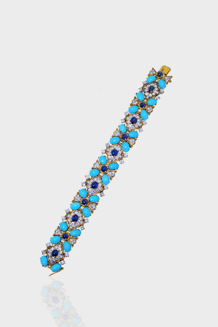 Bracciale in oro giallo e bianco, anni '60, firmato "Ansuini", con elementi polilobati in pavé di diamanti per totali ct 6 ca, probabile colore G-H, purezza IF-VVS ca, alternati a ovali cabochon di turchesi e zaffiri cabochon per totali ct 9 ca.