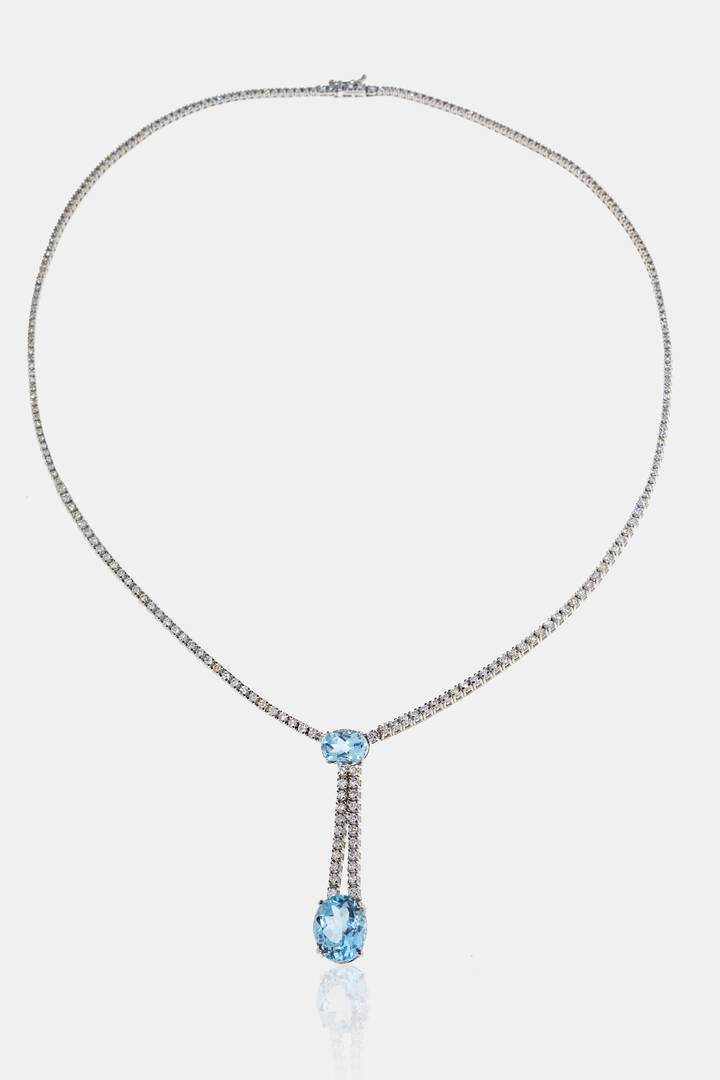 in oro bianco 14 Kt, modello tennis, con diamanti taglio brillante per totali ct 3,50 ca ed al centro due acquamarine taglio ovale per totali ct 4,50 ca