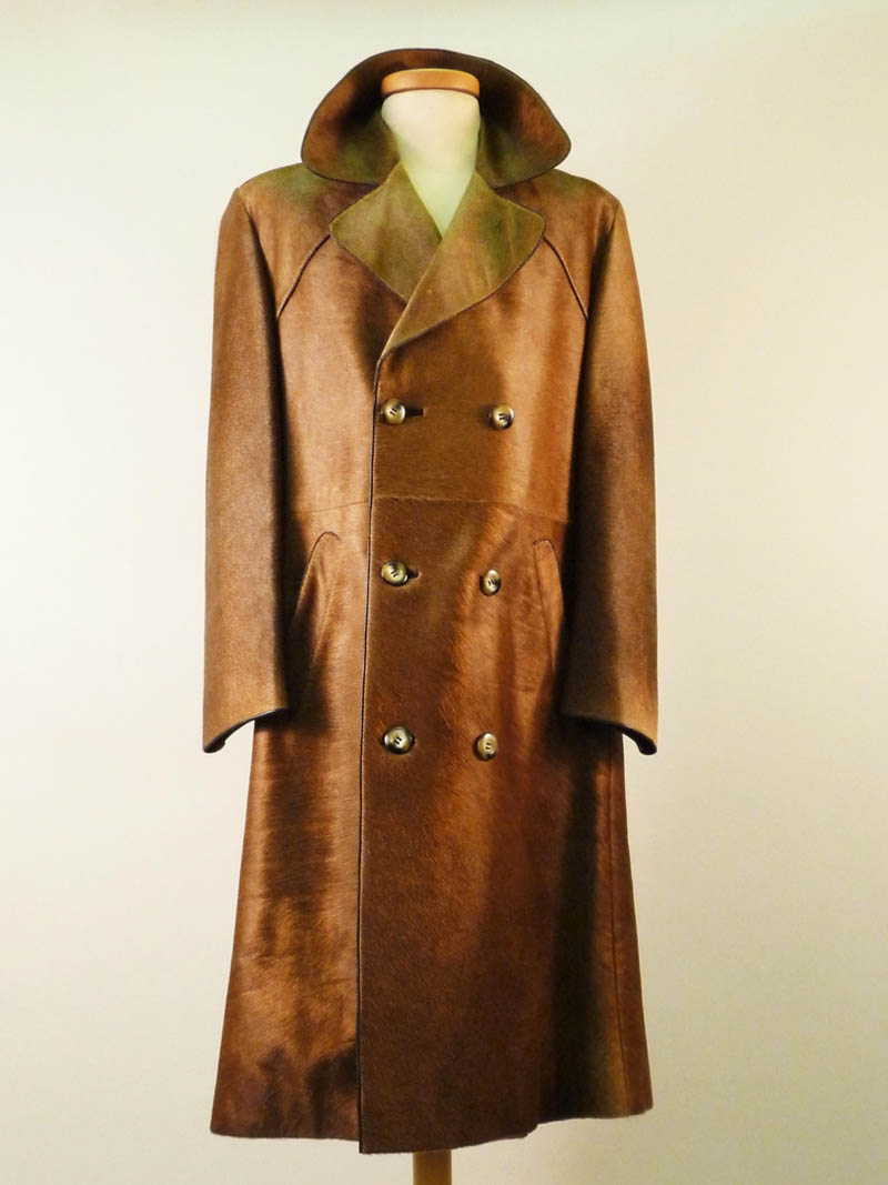 CAPPOTTO DA UOMO IN CAVALLINO COLOR CUOIO - MEN'S COAT IN BROWN HORSE Fur Hand Made Anni Ottanta chiusura a doppiopetto a sei bottoni, finiture e inserti in pelle marrone scuro tg L circa