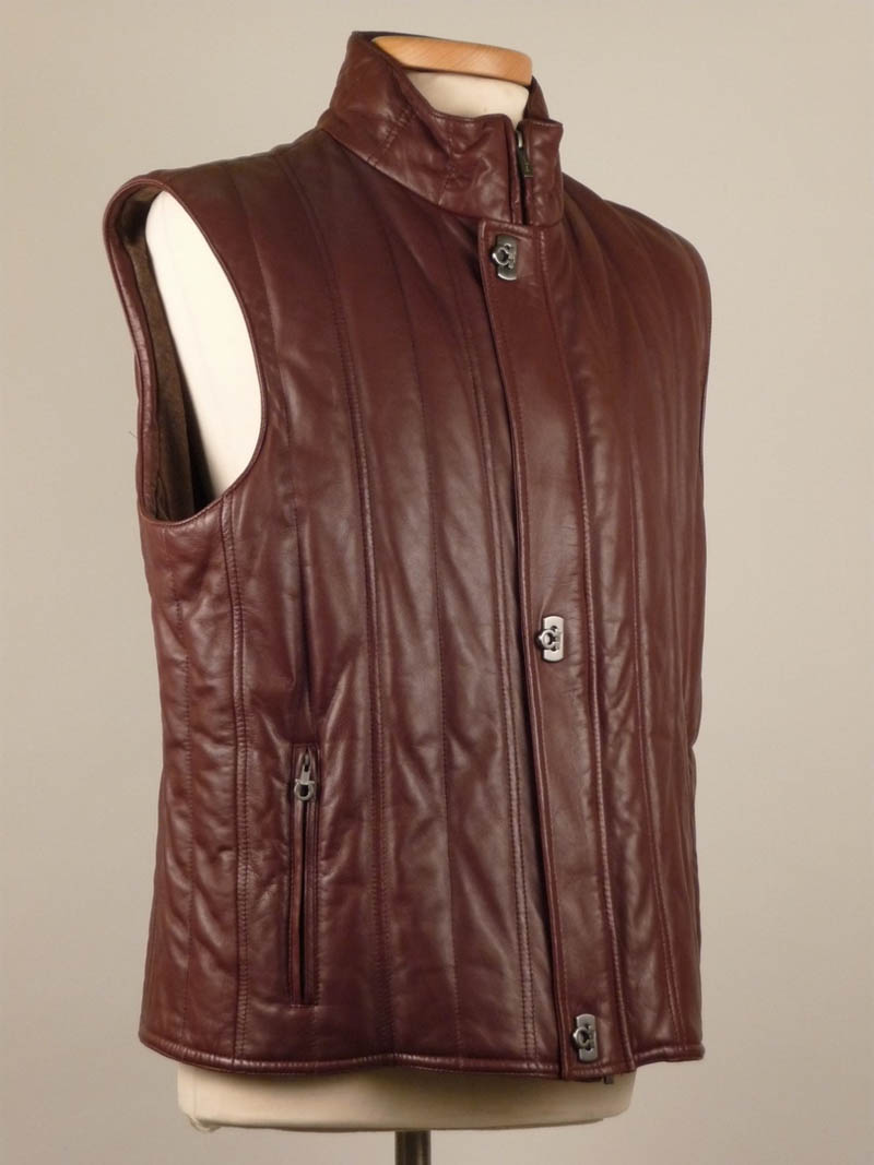 GILET DA UOMO IN PELLE FODERATO IN PANNO - MEN'S LEATHER GILET LINED IN FABRIC Salvatore Ferragamo nei toni del bordeaux, chiusura con cerniera e bottoni in metallo argentato tg M circa
