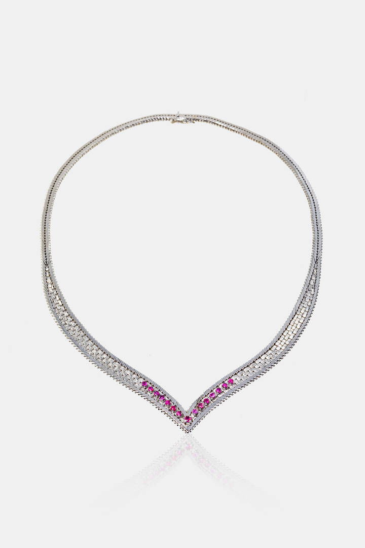in oro bianco, lavorato a tessuto, anni '60, con rubini a decoro per totali ct 0,90 ca