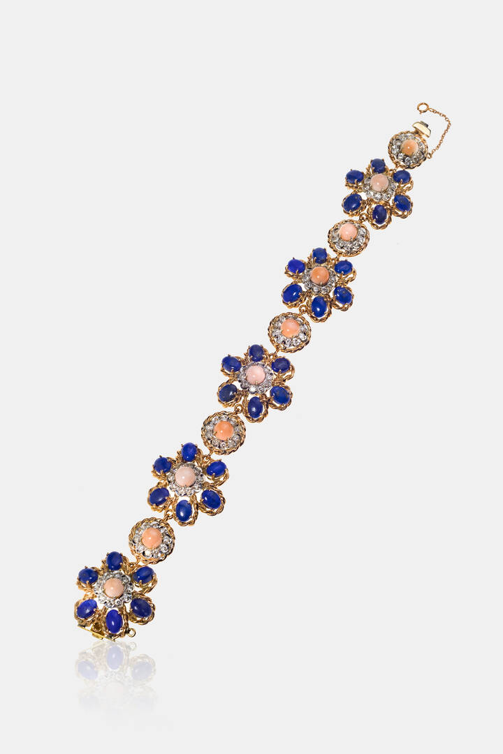 in oro rosa e bianco 14 Kt, anni '60, composto da petali in lapislazzuli cabochon taglio ovale, semisfere di corallo rosa e diamanti taglio brillante per totali ct 2,10 ca, probabile colore G-H, purezza IF-VVS