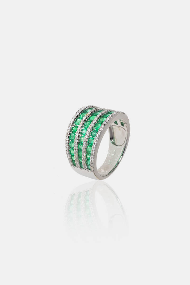 in oro bianco, composto da tre fasce in smeraldi taglio brillante per totali ct 1,80 ca e diamanti taglio brillante per totali ct 0,40 ca, probabile colore G-H, purezza IF-VVS