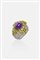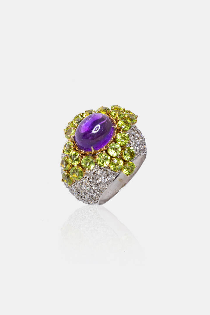 in oro bianco 14 Kt, sommità bombata con pavé di diamanti taglio brillante per totali ct 4,0 ca, probabile colore G-H, purezza IF-VVS, decoro con peridoti taglio ovale e al centro ametista cabochon taglio ovale