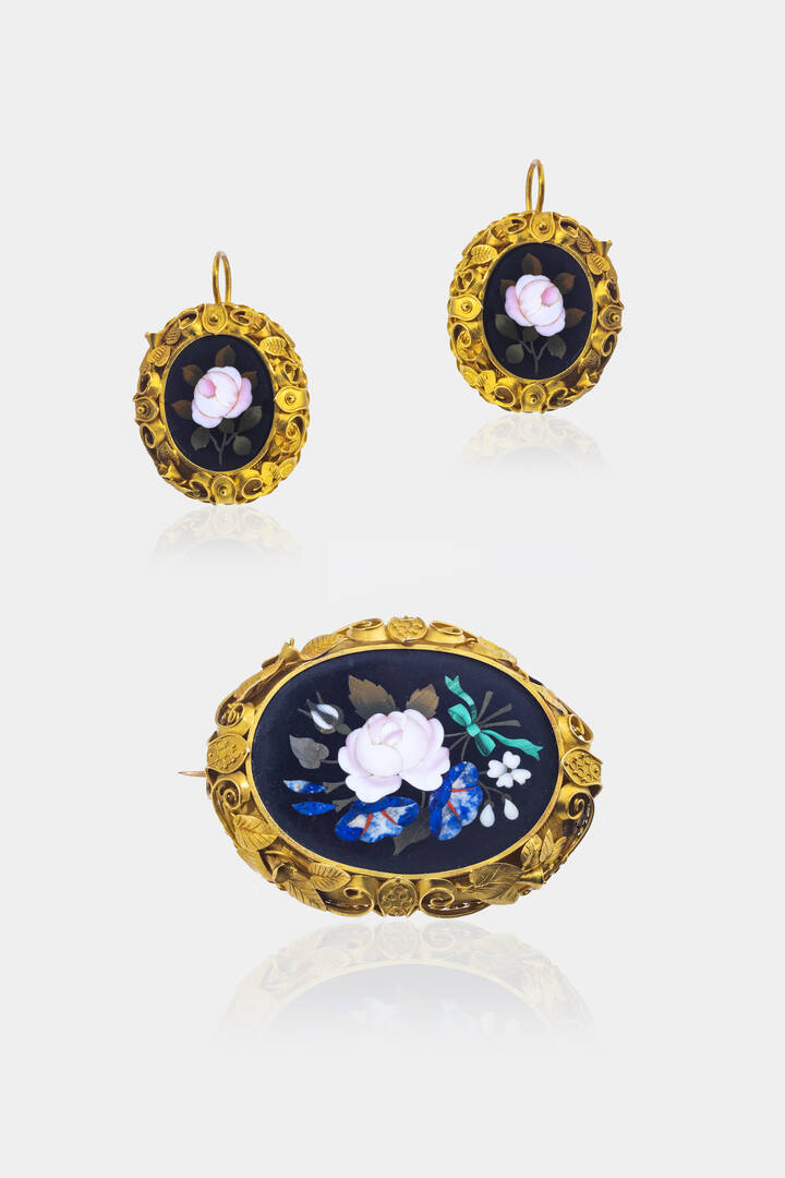 XIX secolo, in oro giallo composta da coppia di orecchini, ad amo, e spilla con commesso di pietre dure raffiguranti fiori montati su base in onice