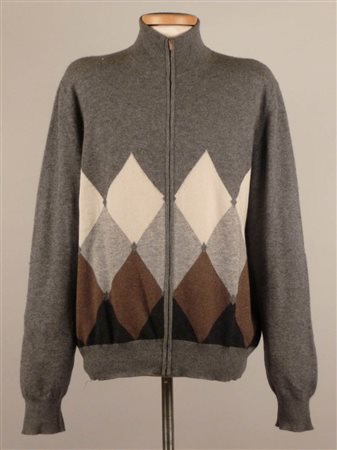 MAGLIA DA UOMO IN CACHEMIRE GRIGIA - MEN'S GRAY CACHEMIRE SWEATHER Kangra chiusura al collo con cerniera e fantasia a motivi geometrici nei toni del beige, marrone, grigio chiaro e nero