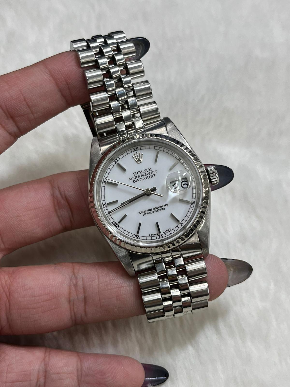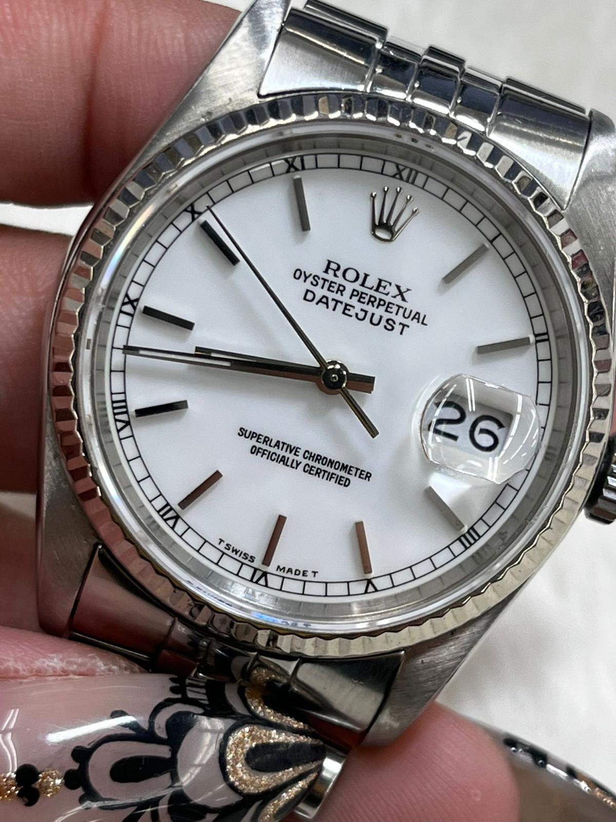 Marca Rolex Modello datejust Ref 16234 Anno 1988 Condizione usato Misura 36 Cassa fori Quadrante bianco Cinturino jubile No documenti rolex, no box Garanzia del negozio di 12 mesi
