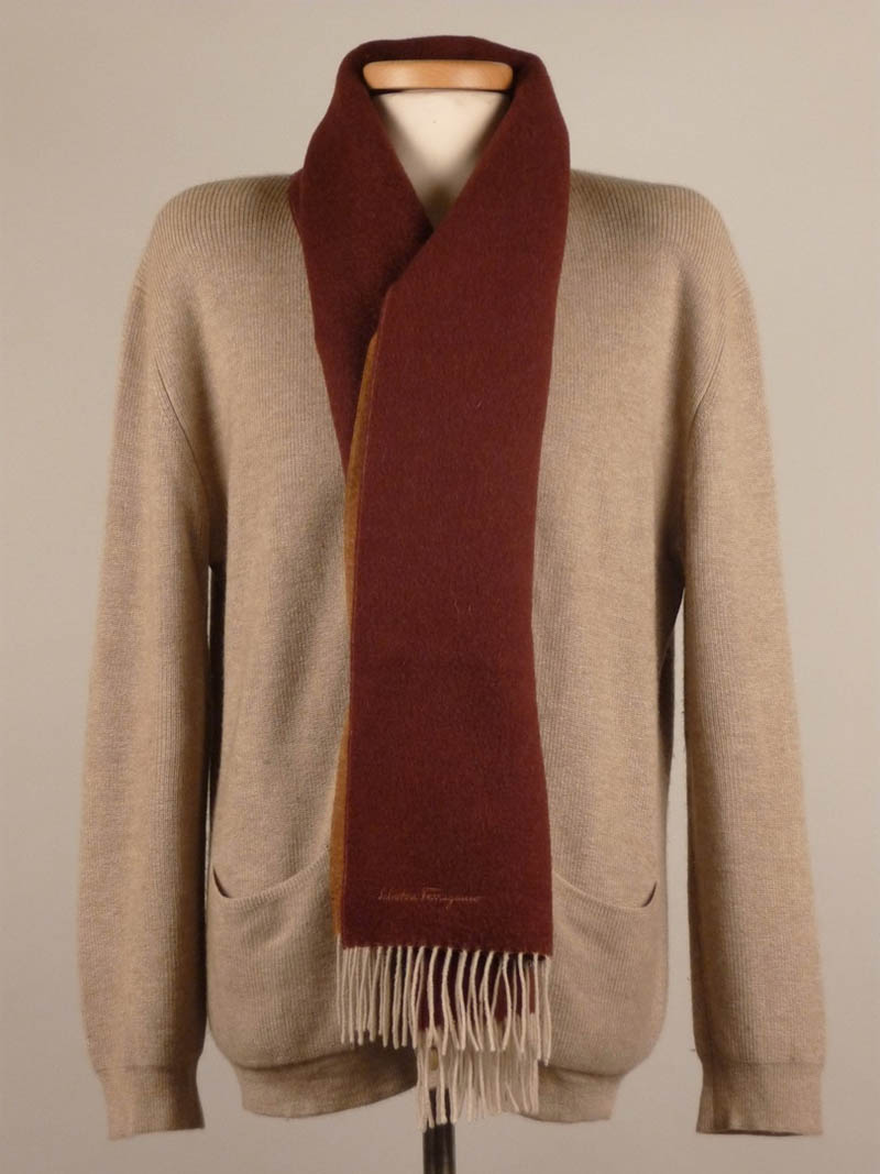 LOTTO - LOT una sciarpa in cachemire da uomo, Salvatore Ferragamo, double face nei toni del bordeaux e marrone ed un cardigan da uomo in cachemire e seta color nocciola (2)