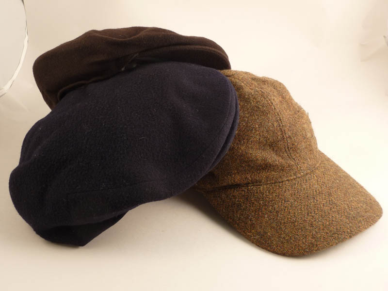 TRE CAPPELLI DA UOMO IN LANA - THREE MEN'S WOOL HATS DUE, Borsalino, blu e marrone ed uno nei toni del verde con applicazione in maglia nocciola, Steady Hood tg L circa