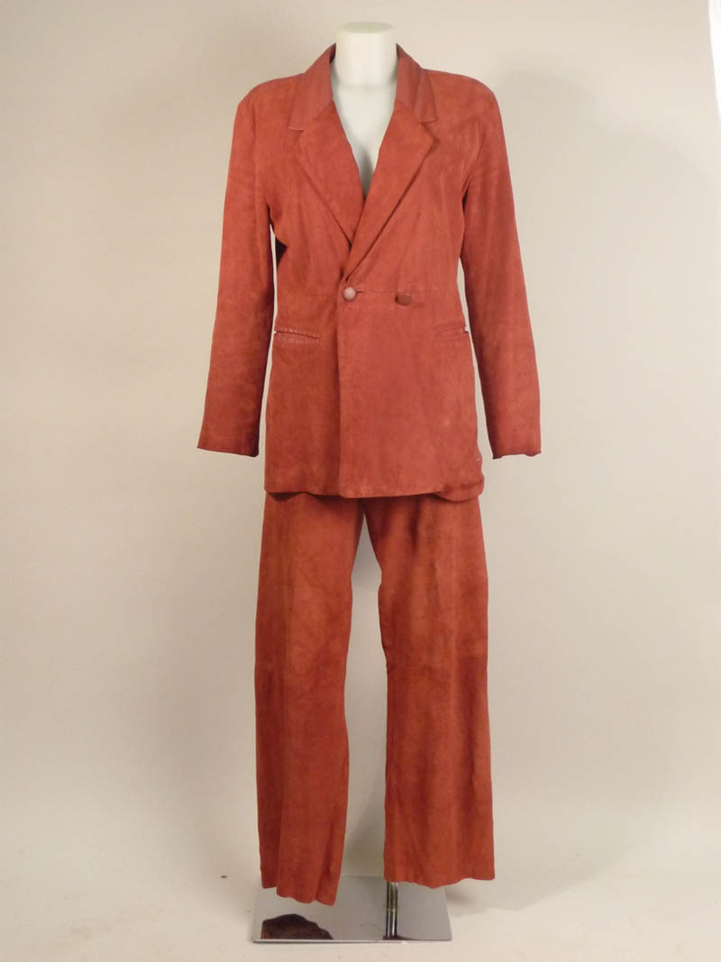 COMPLETO ROSSO IN SUEDE - RED SUEDE SUIT Enrico Coveri, Anni Ottanta giacca a doppiopetto, rever in pelle rossa, tasche a intaglio con profilo in pelle rossa, pantaloni a linea dritta con finitura in pelle, difetti e macchie tg M circa