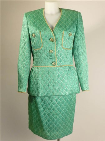 TAILLEUR IN SETA MATELASSÈ VERDE - GREEN SILK MATELLASÈ TAILLEUR Escada corpino avvitato, bottoni gioiello, tasche e balza sulla giacca, gonna dritta tg 40