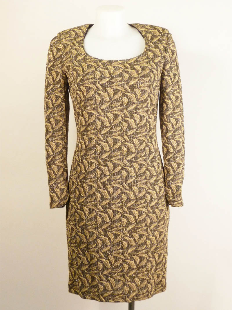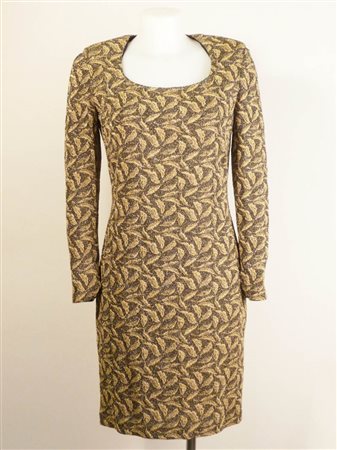 ABITO IN MAGLIA DORATA - GOLD KNITTED DRESS Enrico Coveri Anni Novanta linea dritta, scollo rotondo, fantasia vegetale nei toni dell'oro su fondo nero, maniche lunghe tg 44