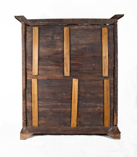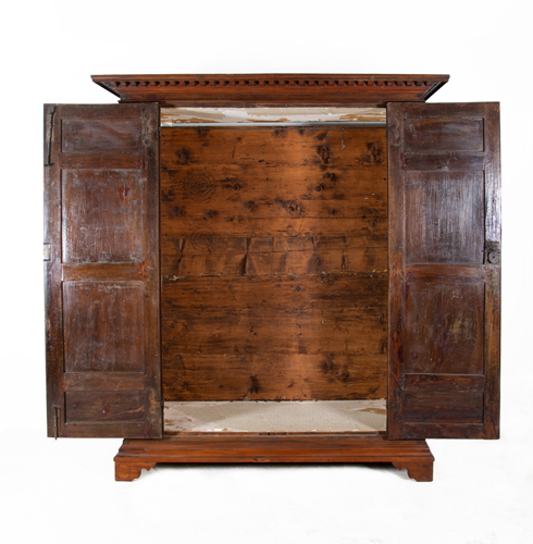 Walnut wardrobe with two paneled doors. Northern Italy. Late 17th century. Minor defects and restorations. 221x196x76 cm approx. Armadio in noce a due ante pannellate. Italia settentrionale. Fine XVII secolo. Lievi difetti e restauri. 221x196x76 cm ca.