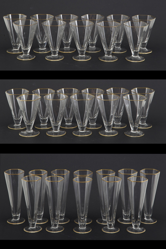 Set of twelve hexagonal glasses in blown crystal with gold edges, composed of flutes, water glasses and wine glasses. 20th century. Servizio da dodici di bicchieri esagonali in cristallo soffiato e bordi dorati composto da flute, bicchieri per l'acqua e per il vino. XX secolo.