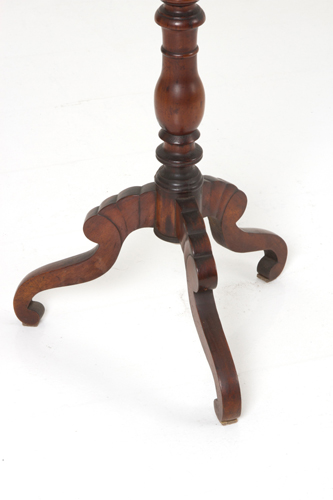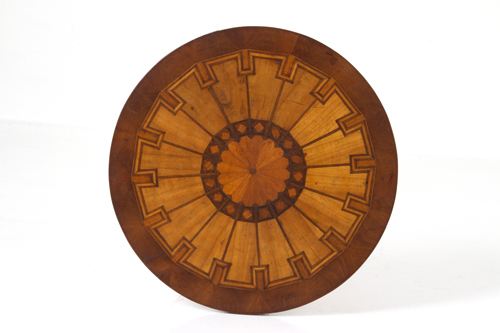 Coffee table with top veneered in various woods and inlaid with geometric motifs and turned three-legged leg. 19th century. 75x43 cm approx. Tavolino con piano lastronato in legni vari e intarsiato a motivi geometrici e gamba tornita a tre piedi. XIX secolo. 75x43 cm ca.