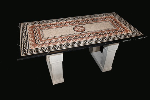 Table with inlaid marble top and geometric decorations. 19th century. 70x180x90 cm approx. Tavolo con piano in marmo intarsiato e decori geometrici. XIX secolo. 70x180x90 cm ca.
