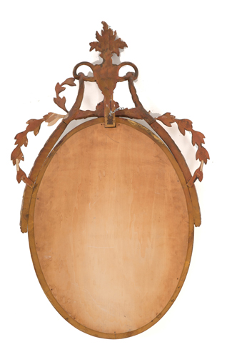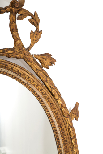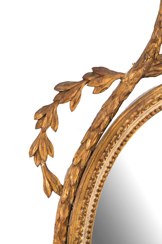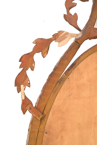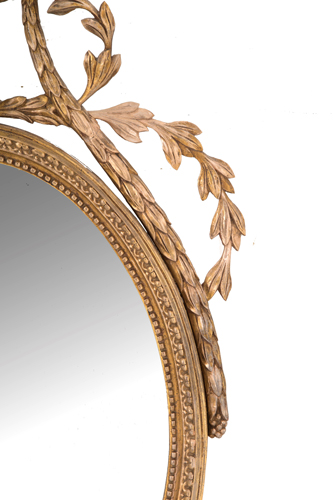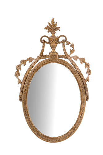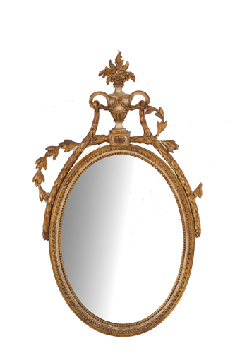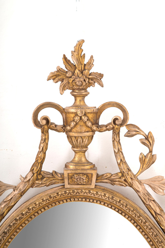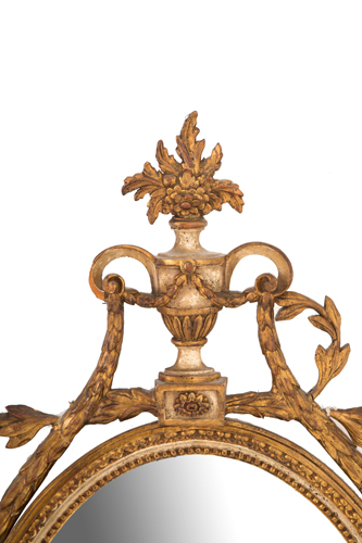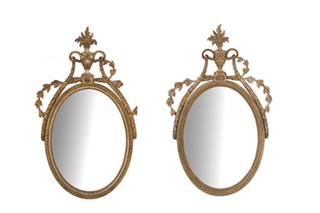 Pair of oval mirrors in carved and gilded wood with vases and festoons. 19th century. Defects and missing parts. 115x74 cm approx. Coppia di specchiere ovali in legno intagliato e dorato con vasi e festoni. XIX secolo. Difetti e mancanze. 115x74 cm ca.