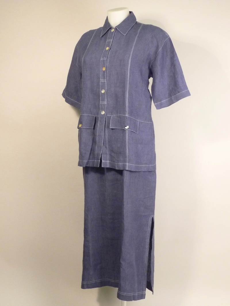 COMPOSÈ IN LINO AZZURRO - LINEN BLUE SUIT I Naturali composto da una giacca a manica corta con punti a vista in bianco, bottoni in madreperla e abito senza maniche lungo con spacchi laterali tg XL