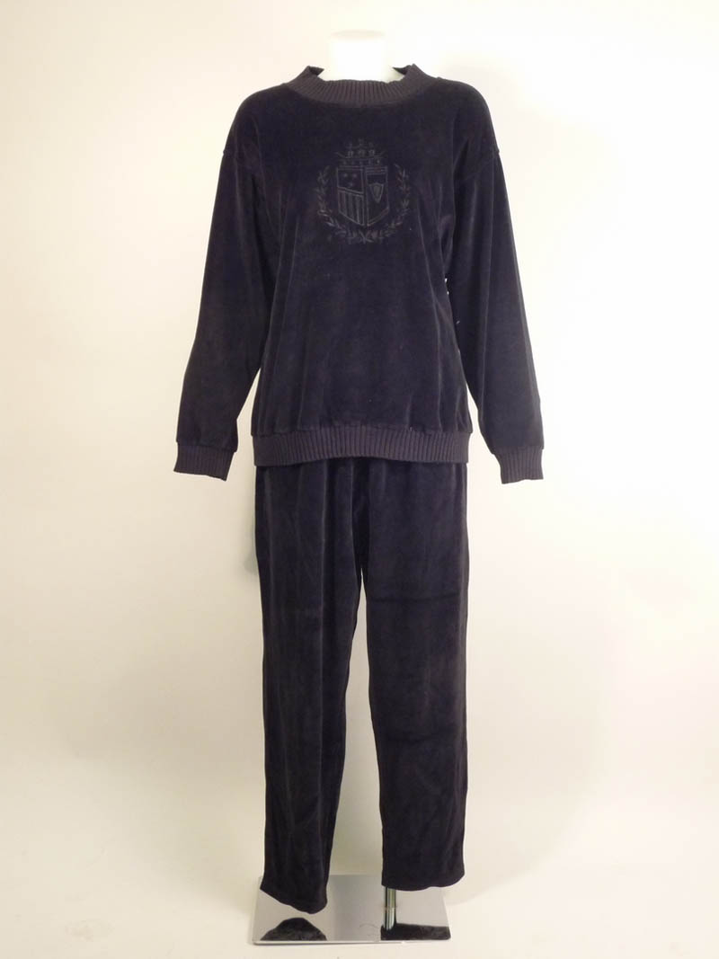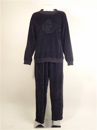 TUTA DA CASA IN CINIGLIA NERA - VELVET BLACK SUIT Elisabeth, Anni Novanta manica lunga, scollo in maglia, stemma ricamato sul davanti, pantaloni a linea dritta tg M