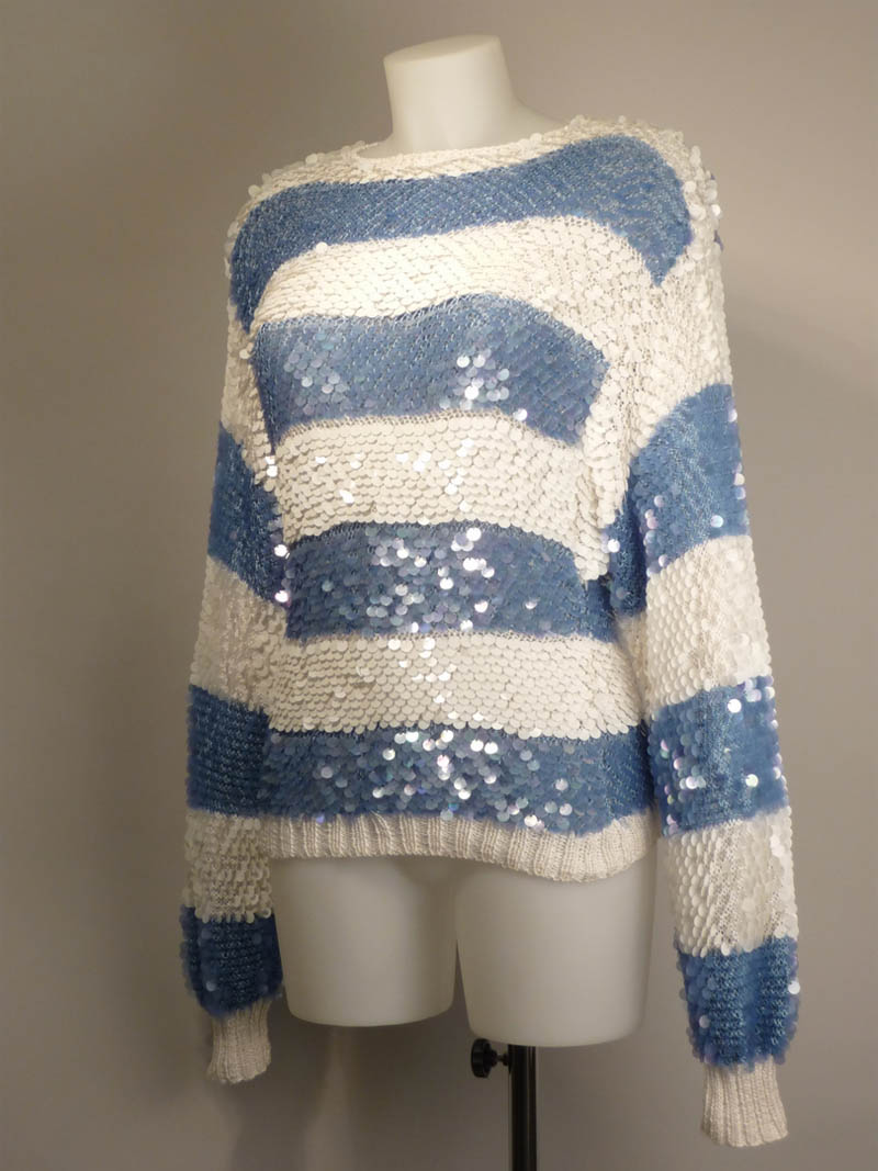 MAGLIA IN SETA E PAILLETTES BIANCHE E CELESTI - SILK LIGHT BLUE AND WHITE PAILLETTES BLOUSE Enrico Coveri Paillettes, Anni Ottanta interamente realizzata in paillettes disposte a formare grosse righe orizzontali tg M