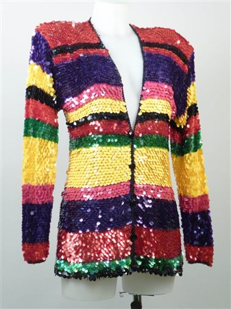 CARDIGAN IN SETA E PAILLETTES MULTICOLORI - SILK AND PAILLETTES CARDIGAN Enrico Coveri Paillettes, Anni Ottanta interamente realizzata in paillettes a formare grosse righe orizzontali nei toni del rosso, giallo, verde e nero tg M