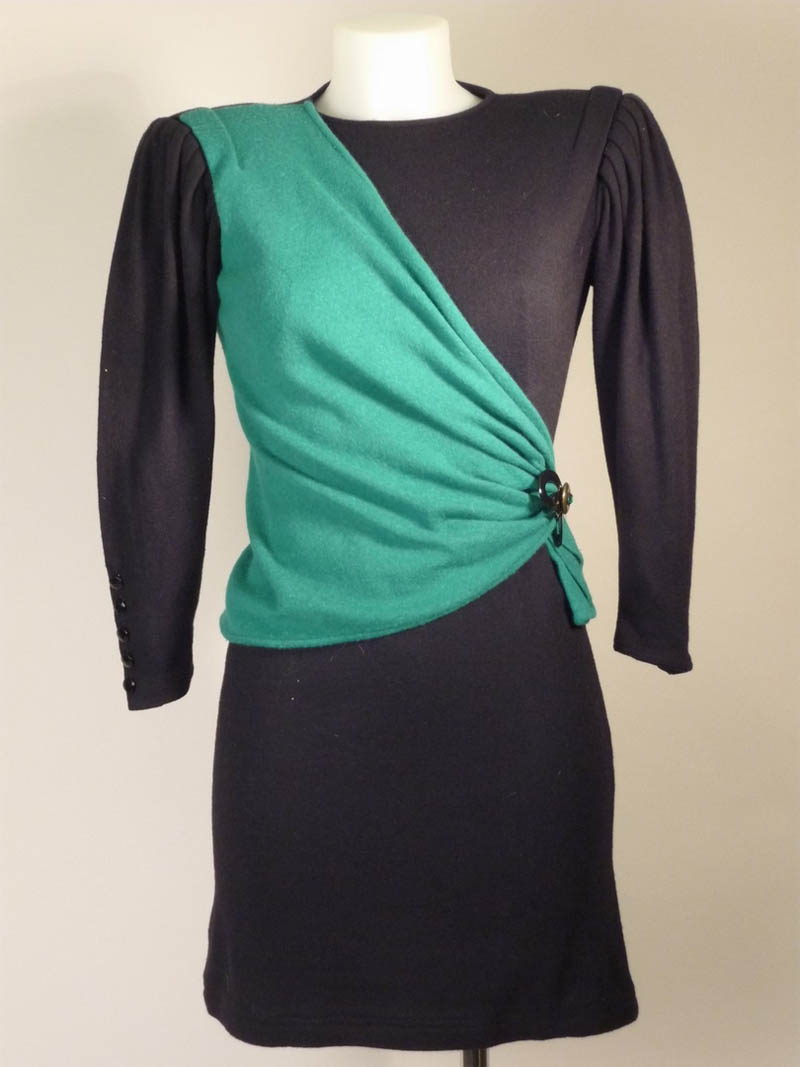 COMPLETO IN JERSEY DI LANA VERDE E NERO - WOOL JERSEY DRESS IN GREEN AND BLACK COLOURS Ungaro corpino incrociato ripreso sul lato da spilla nera e oro impreziosita da strass, chiusura posteriore con cerniera, lievi difetti tg 6