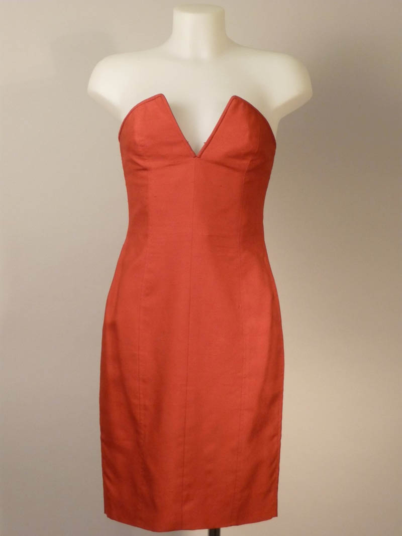 VESTITO DA COCKTAIL IN SHANTUNG DI SETA ROSSO - RED SHANTUNG SILK DRESS Ungaro Parallele, Anni Ottanta corpino a bustier e gonna dritta al ginocchio tg 6