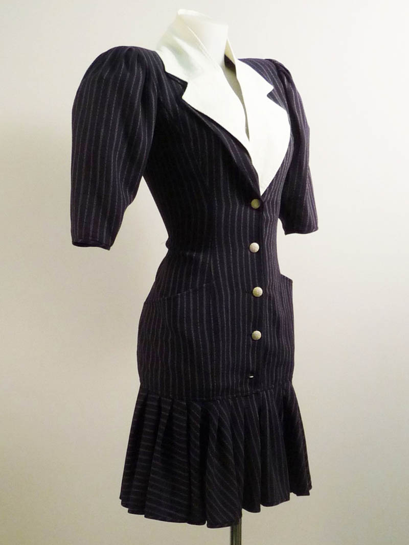 ABITO IN LANA BLU GESSATO - BLUE WOOL DRESS WITH WHITE PINSTRIPE Ungaro Parallele inea dritta, balza sul fondo, manica a tre quarti e apertura sul davanti con abbottonatura, colletto bianco tg 4
