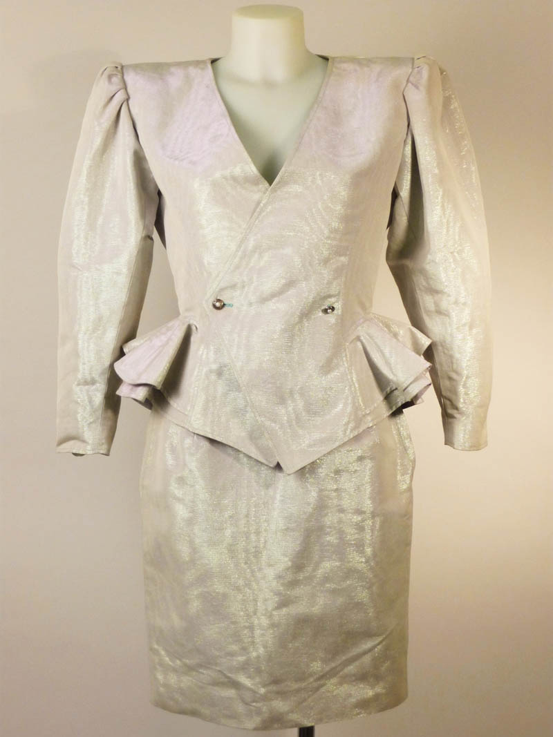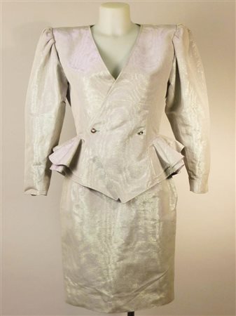 COMPOSÈ DA SERA IN MOIRE LAMINATO COLOR GHIACCIO - LAMÈ MOHAIR EVENING COMPOSÈ Ungaro Parallele, Anni Ottanta giacchina avvitata con balze laterali, chiusura a doppiopetto con bottoni gioiello, maniche a tre quarti, gonna dritta tg 10